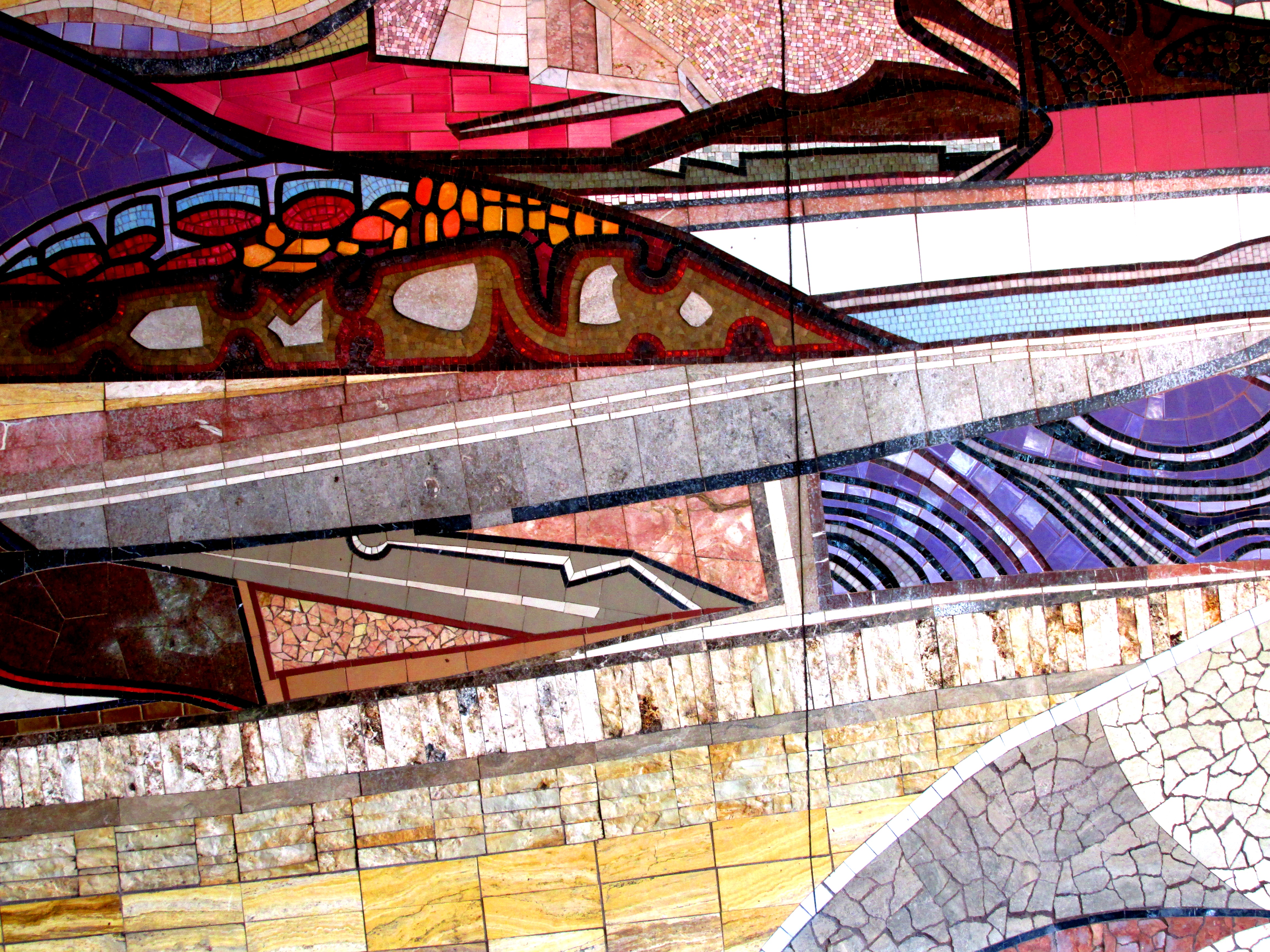 The Land Pavilion mosaic has approximately 150,000 individually cut and shaped pieces in 131 different colors. The pieces are made of marble, granite, slate, Byzantine glass, Venetian glass, gold, mirror, ceramic and pebbles.