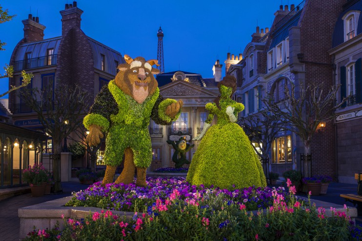• Anna and Elsa in full floral splendor appear (new last year) move to a fresh topiary vignette straight from the hit Disney film, “Frozen.” In the Norway pavilion scene that’s wired to twinkle by night, Elsa works her magic to conjure a colorful spring garden. About 25 varieties of flowers are planted to evoke the scene. Florals including hot pink, red, and orange Gerberas, blue and yellow Violas, violet Petunias and purple Dianthus blanket the spring transformation. Anna and Elsa topiaries are each about 6-1/2 feet tall and are created with plants that include variegated Ficus, green Ficus and the succulent Sedum Coral Reef. But Elsa will look taller because she’s standing closer to guests than Anna by about 8 feet.
