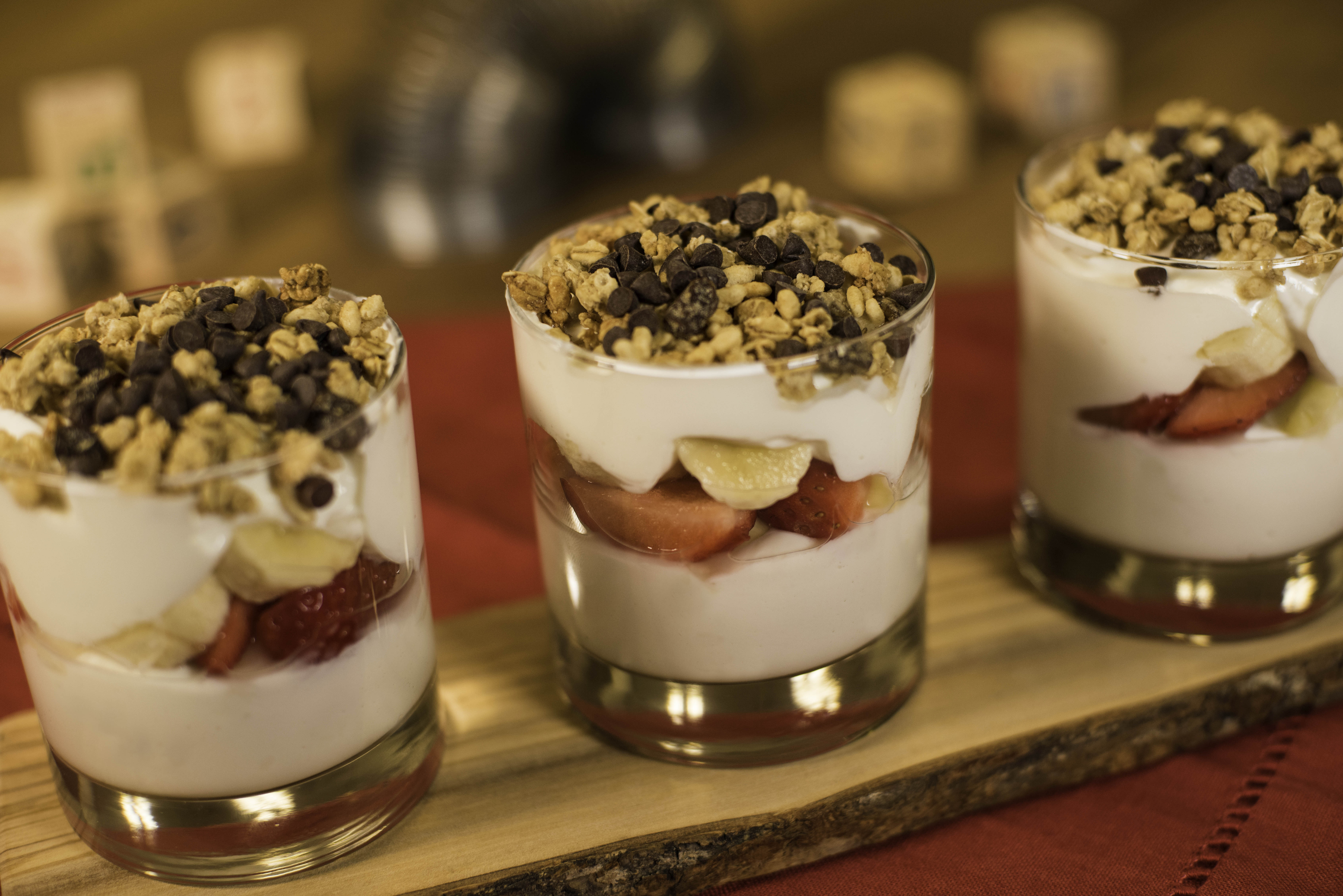 - Banana Split Yogurt Parfait. Layers of banana-vanilla Greek yogurt (with a hint of honey), fresh bananas, strawberries, and pineapple topped with granola and chocolate chips. A delicious way to start the day!