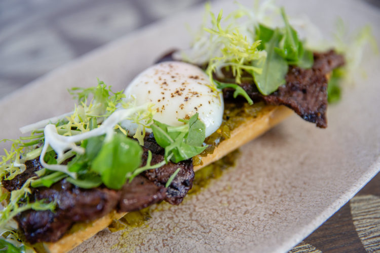 Grilled Skirt Steak served over a grilled baguette with pepper relish and topped with egg is offered at Three Bridges Bar & Grill in Disney’s Coronado Springs Resort at Walt Disney World Resort in Lake Buena Vista, Florida. (Steven Diaz, photographer)